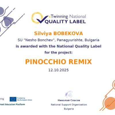Национален знак за качество - etwinning проект "Pinocchio Remix"
