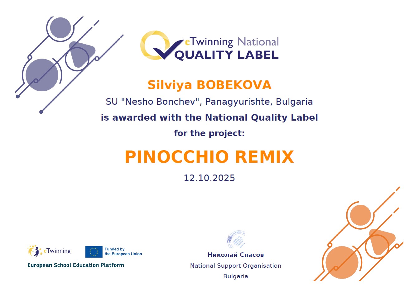 Респект към труда на бончевци, които с ентусиазъм, проучвания, талант, творчество и постоянство развиха редица умения и компетентности, и допринесоха за получаването на признание за училището еTwinning Национален знак за качество 2025. Наслада за душите на творците е когато трудът е официално признат – искрени емоции, фантастична себеотдаденост, страсти, качество, ангажираност, сътрудничество в международна среда!